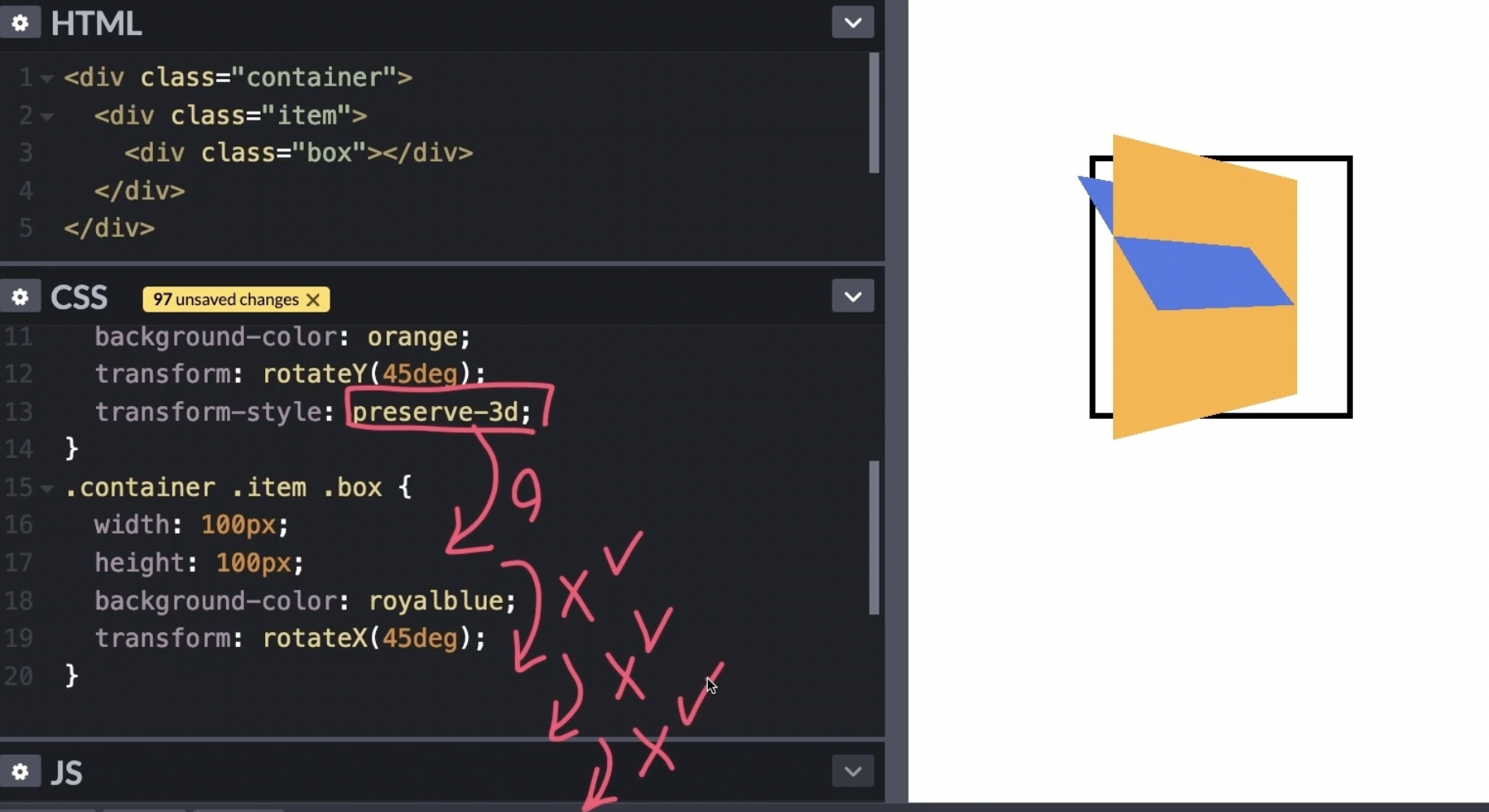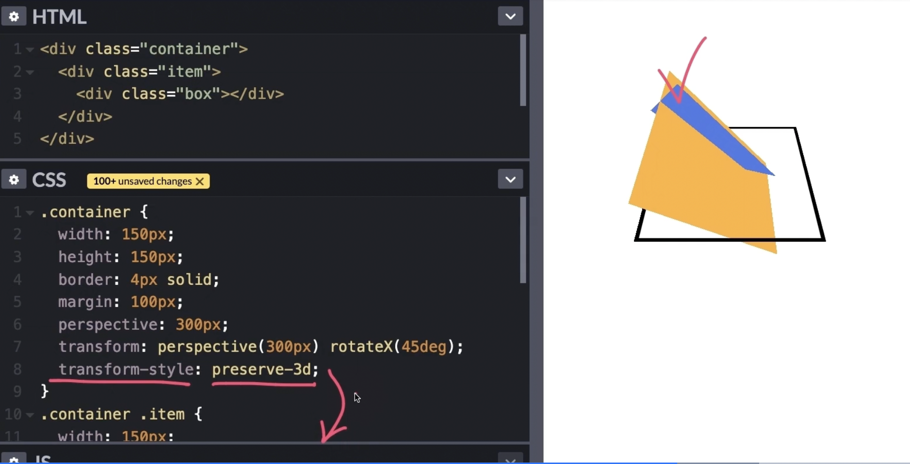 => .item .box에 45도 회전시킨 것을 보기위해 .item에 transform-style: preserve-3d를 적용시켜주었다.