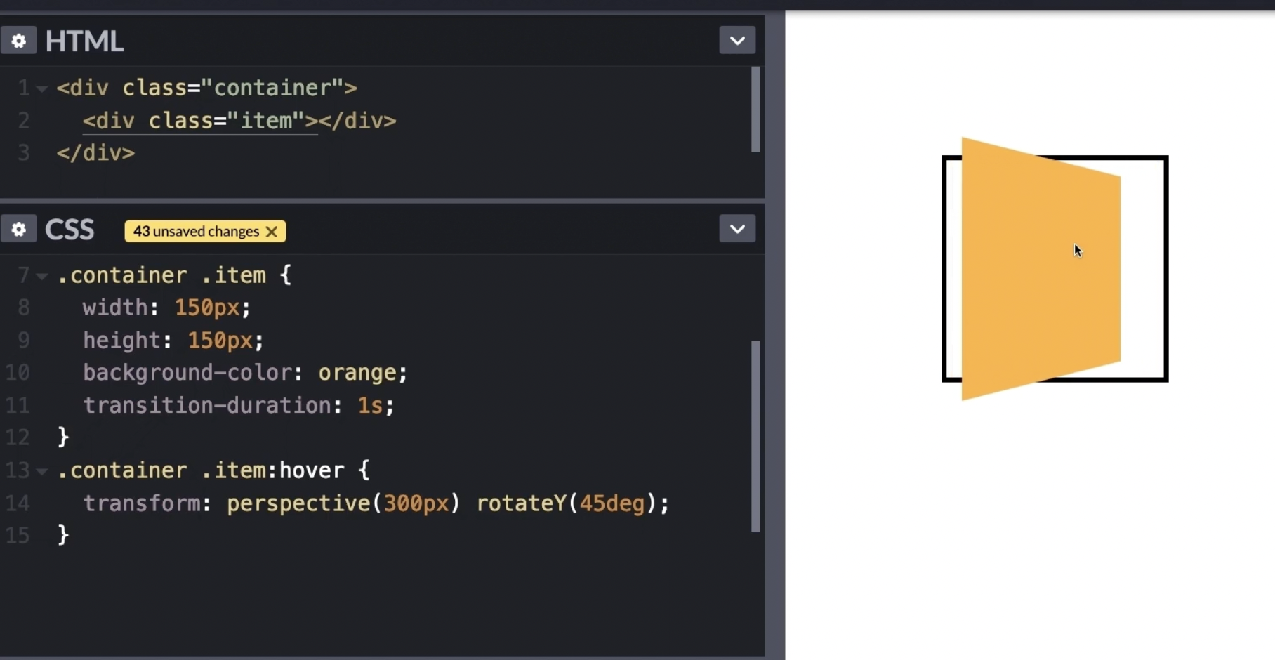 transform : perspective(원근거리px) rotateY(회전각도deg)