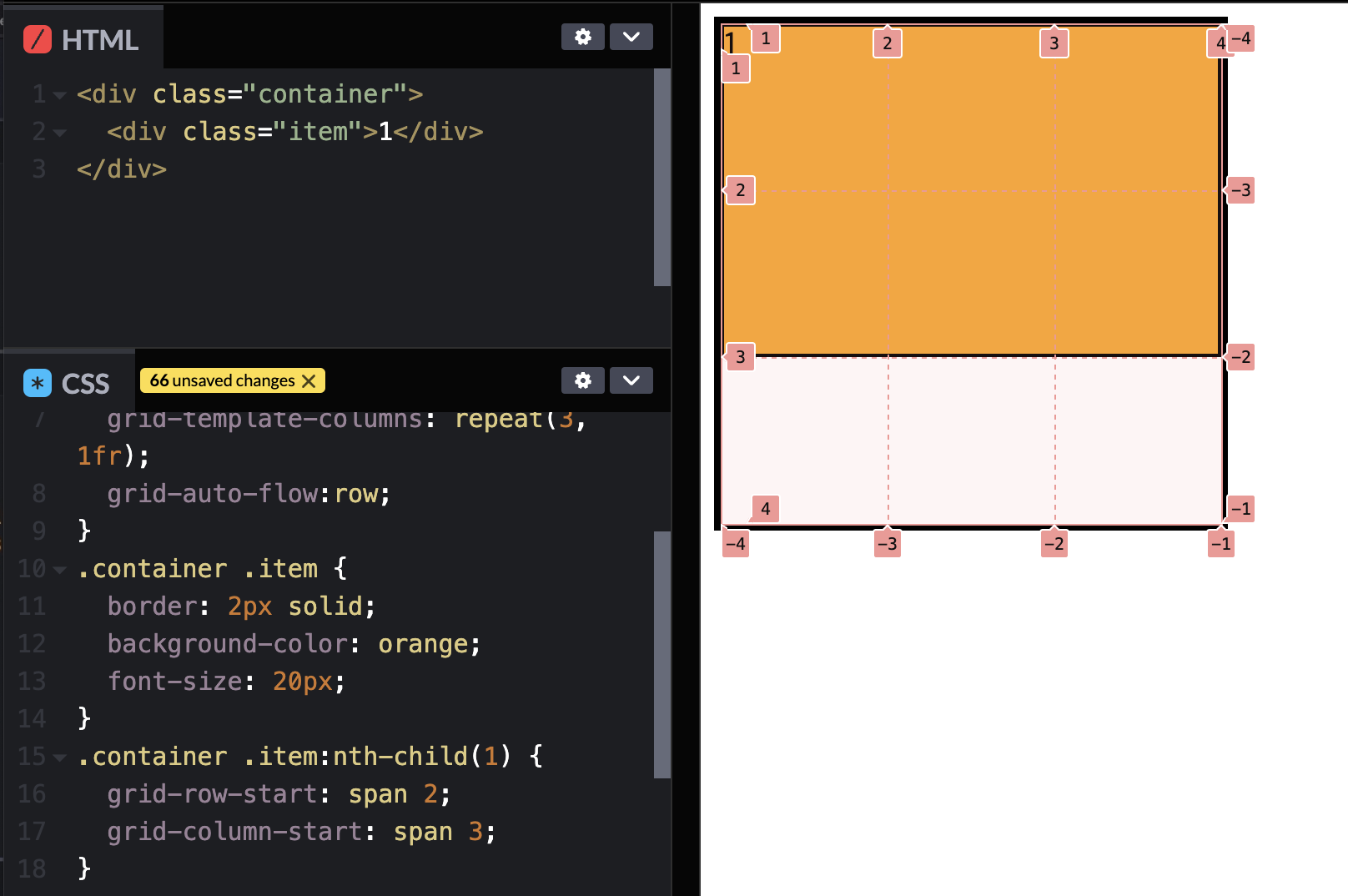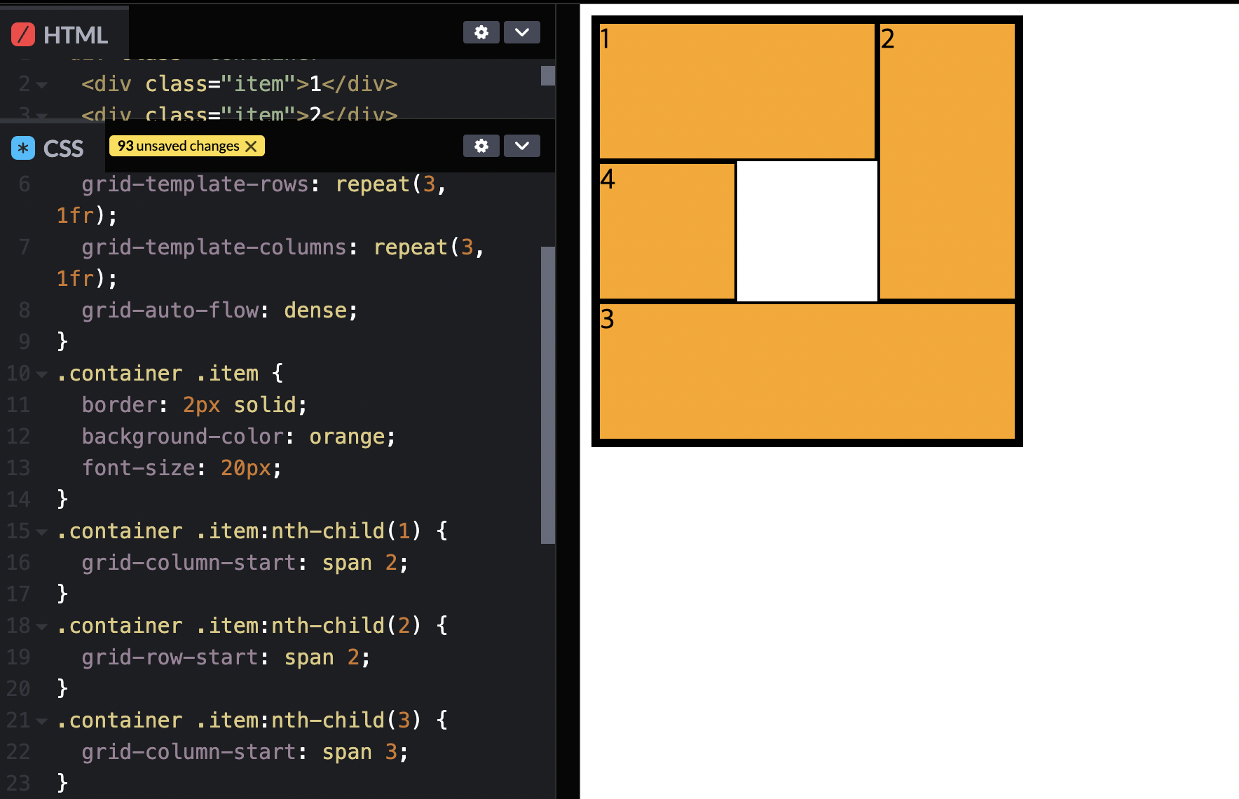 명시적으로 3개의 행만 만들어서 4는 암시적인 행에 위치한다. => 4를 빈공간에 위치하게 하자. => grid-auto-flow: (row) dense;