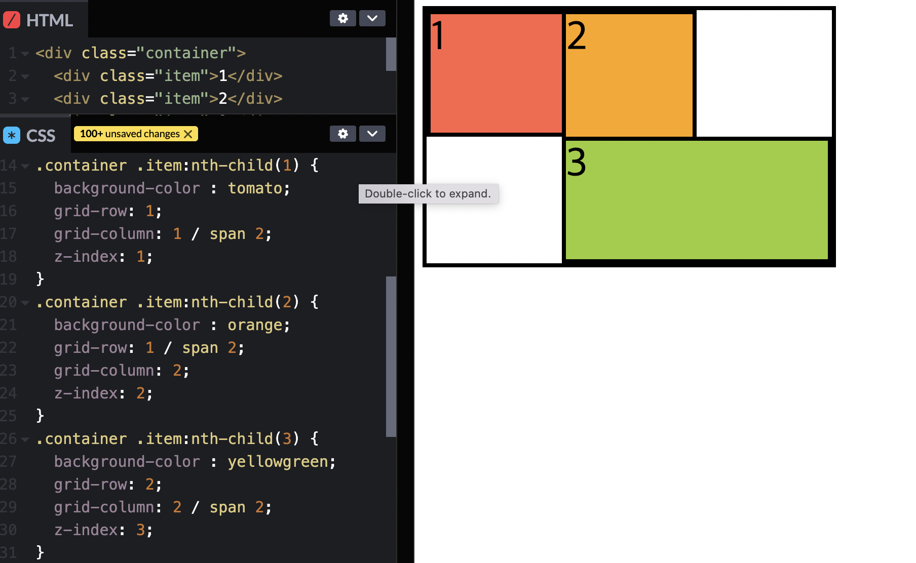grid-row, grid-column을 사용해서 적절히 쌓이게 한다. 숫자 순서대로 쌓임 => z-index 속성을 사용하여 인위적으로 결정할 수 있다.
