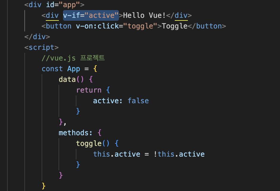 Hello Vue! 를 화면에 보여지거나 보여지지 않게 v-if="active"