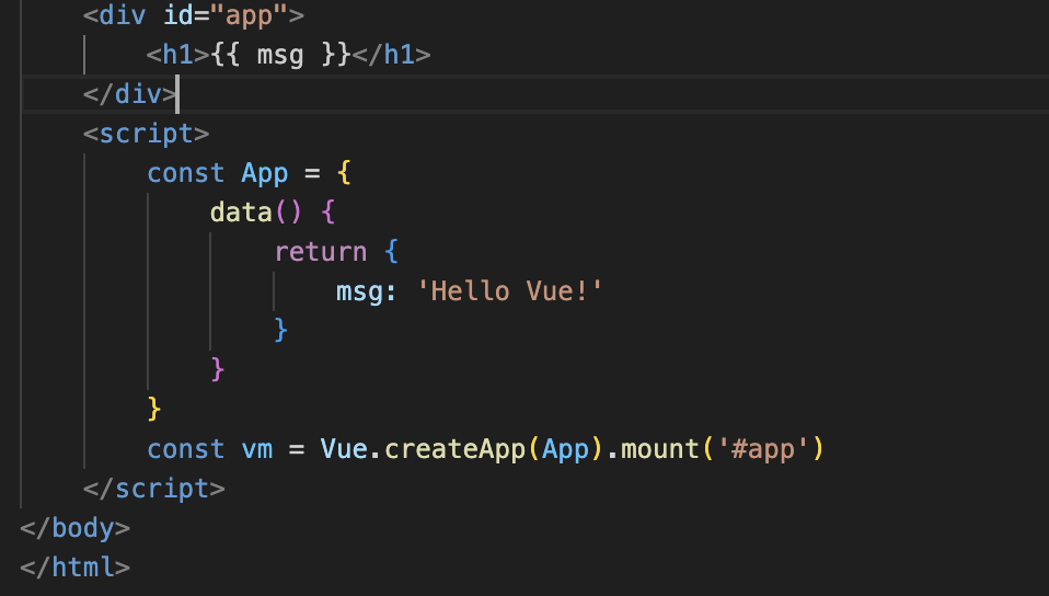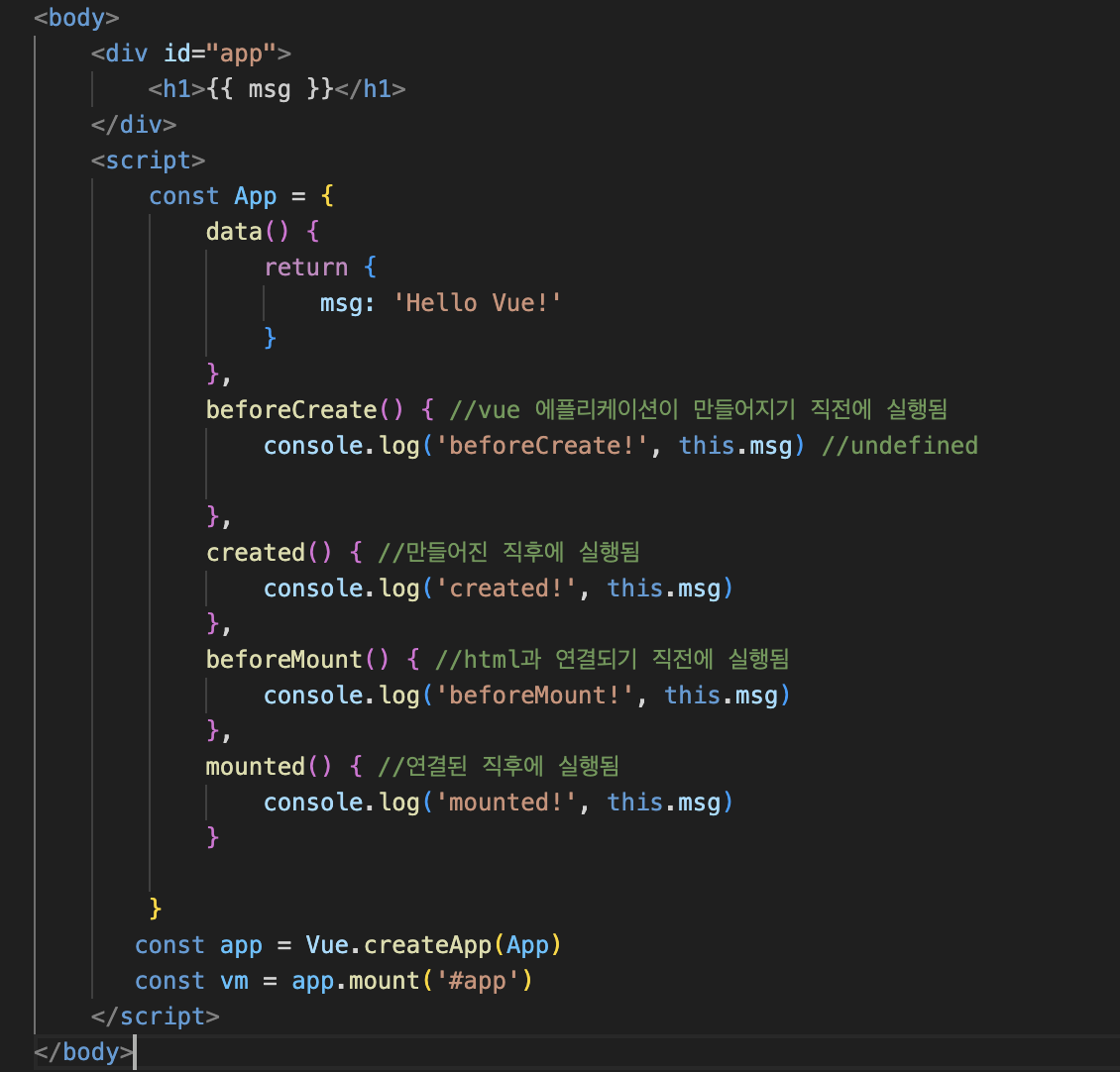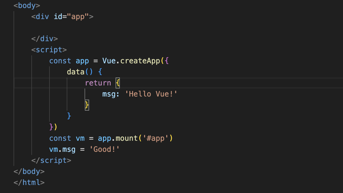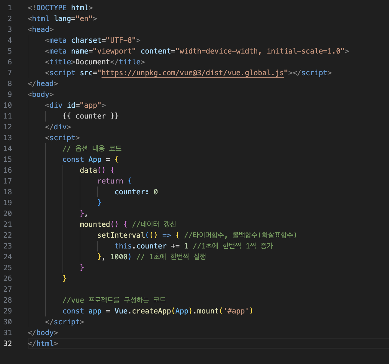 1) createApp 메소드로 vue.js 애플리케이션을 만들고