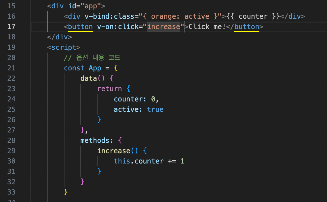 click me 버튼을 누를 때 마다 methods의 increase 메소드를 실행할 수 있도록 연결