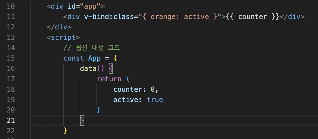 class에 데이터를 넣을 때 v-bind:class="" , 디렉티브라는 vue.js 문법을 붙여주어야한다.
