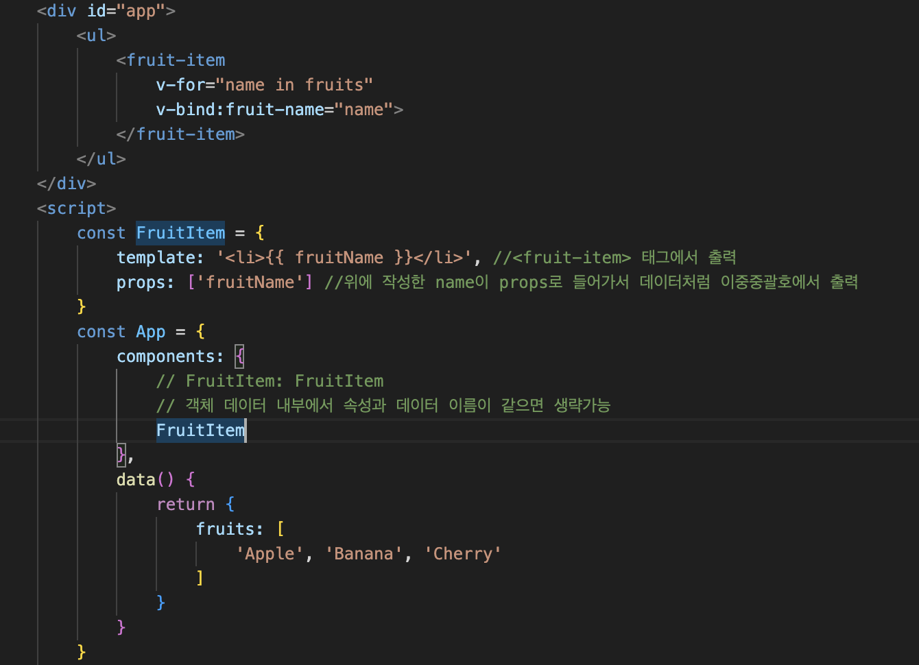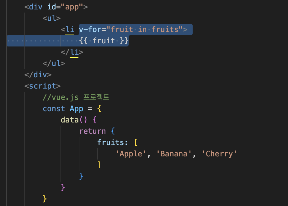 fruits 배열 데이터를 v-for 디렉티브에 입력