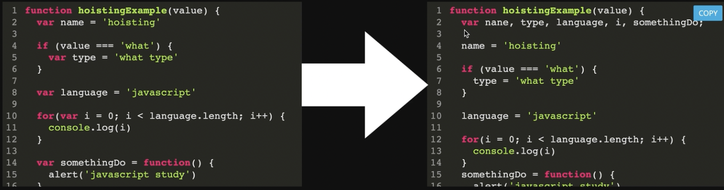 - 함수 선언부 위로 끌어올려지기 때문에 값 할당 전에 호출될 수 있다.