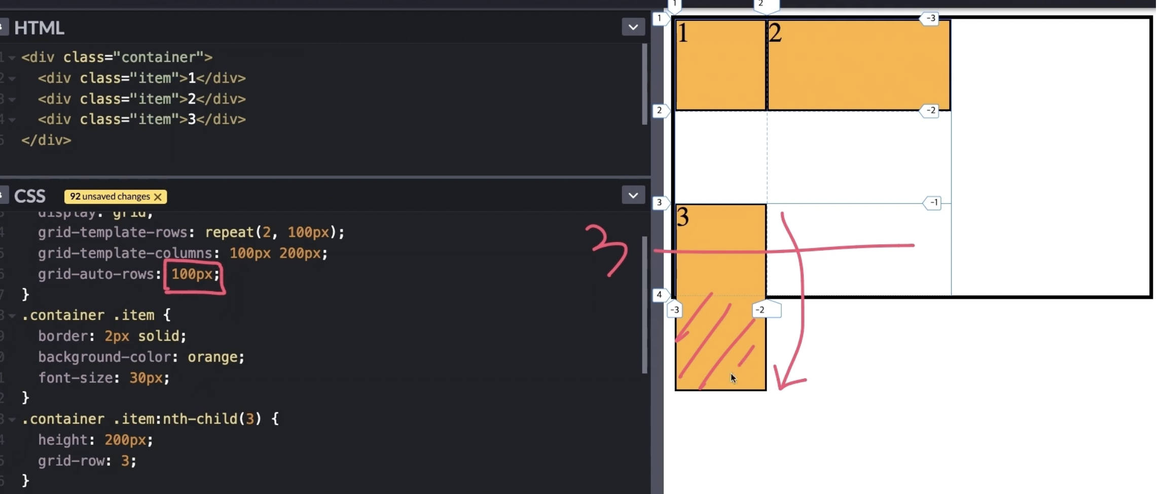 명시적으로 3개의 행만 만들어서 4는 암시적인 행에 위치한다. => 4를 빈공간에 위치하게 하자. => grid-auto-flow: (row) dense;