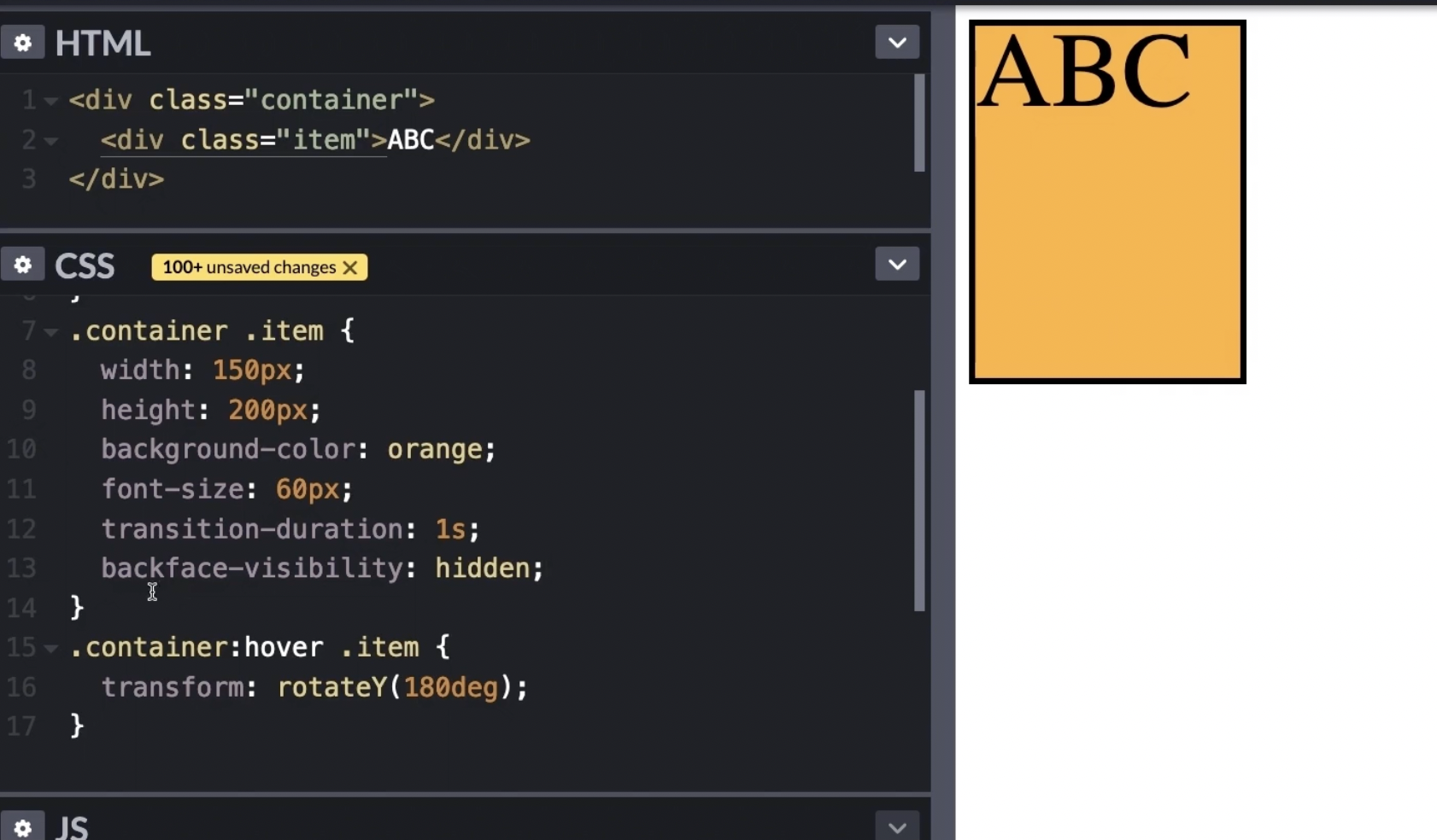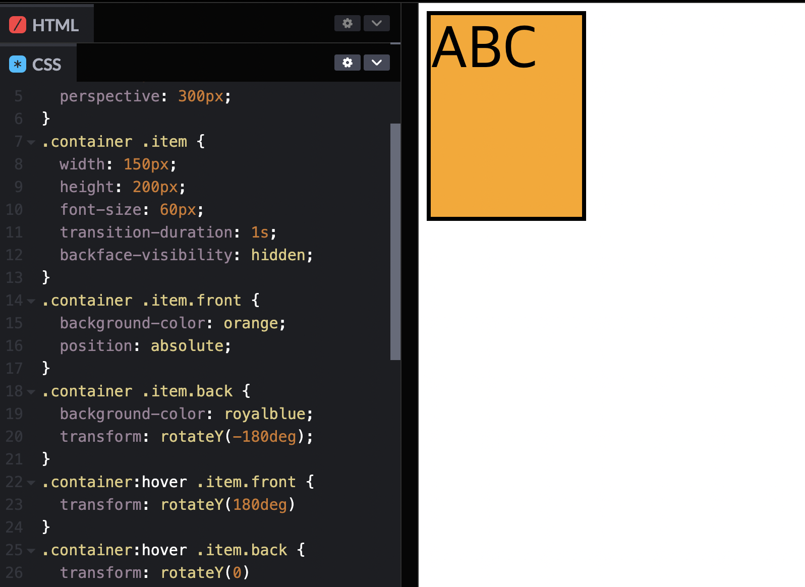 transform : perspective(원근거리px) rotateY(회전각도deg)