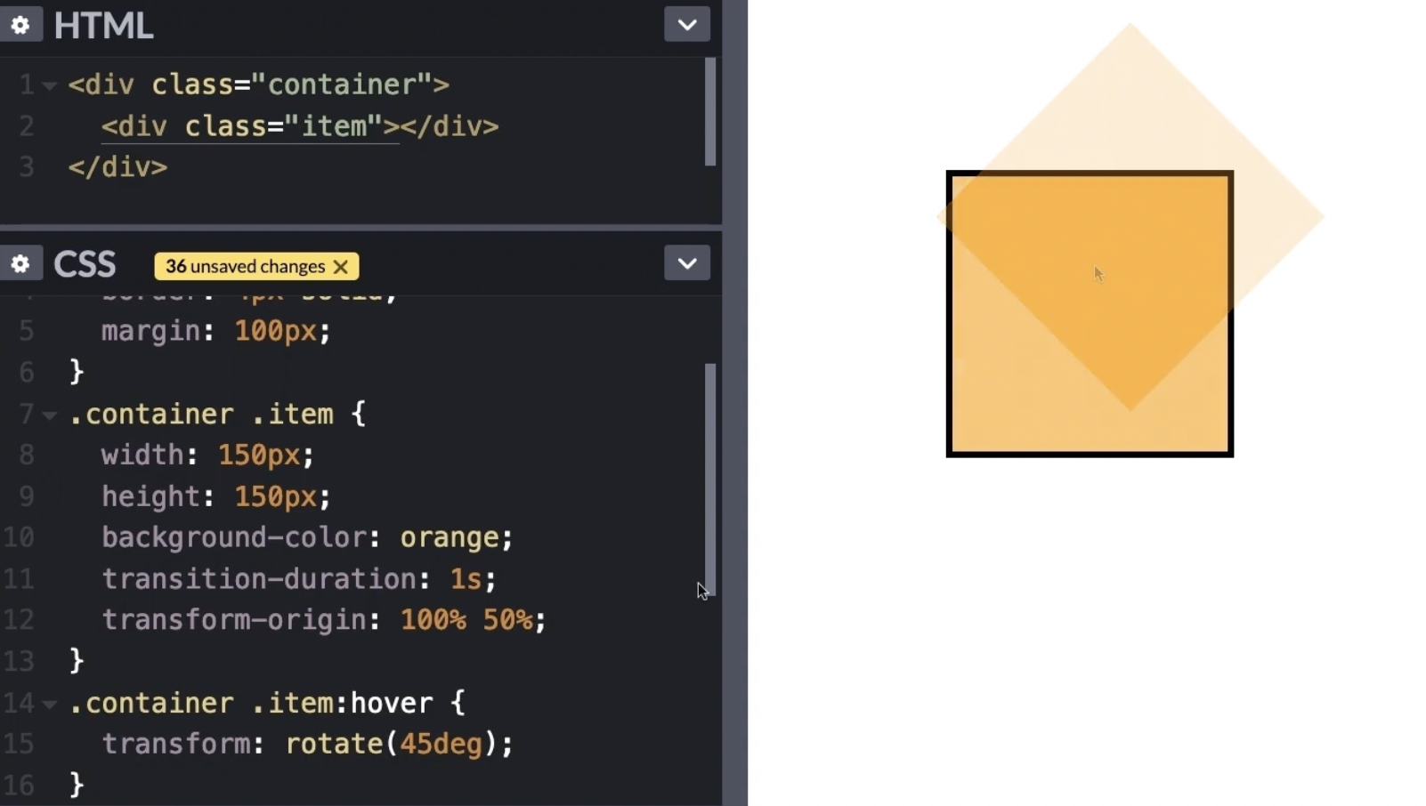 가상클래스선택자 hover를 추가해서 아이템에 마우스를 올리면 요소가 45도 회전한다.
