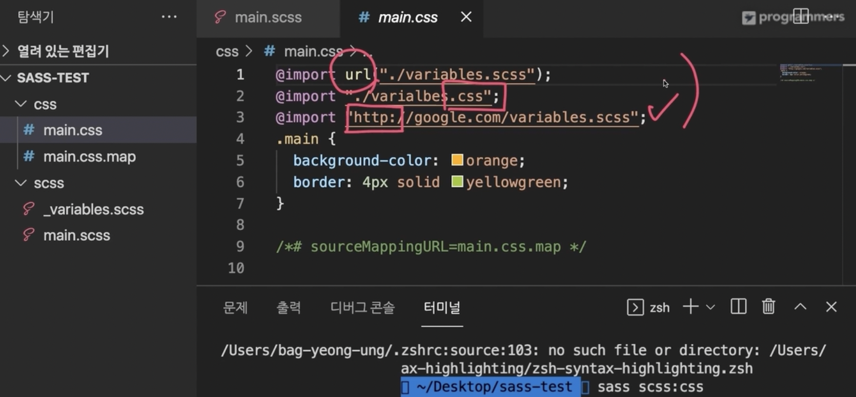 main.scss 파일에 @import "가져올 파일 경로" (=> 확장자 , url 함수, _기호 생략)를 입력하면 해당 파일을 가져온다.