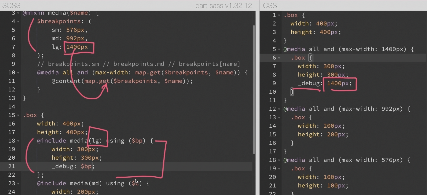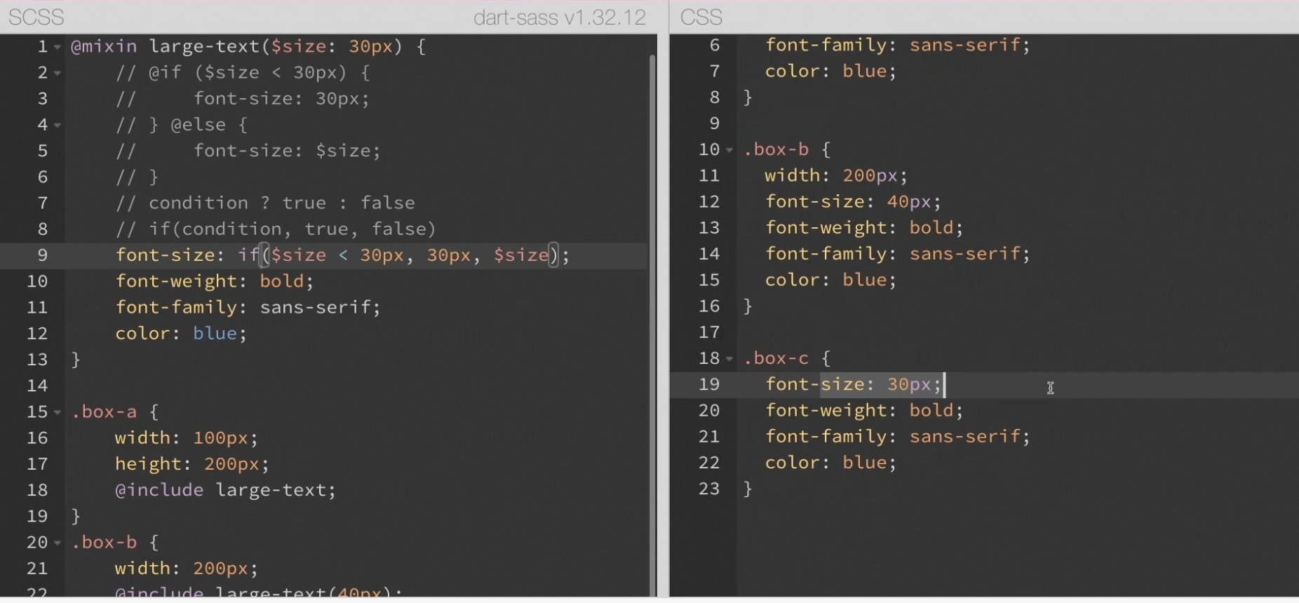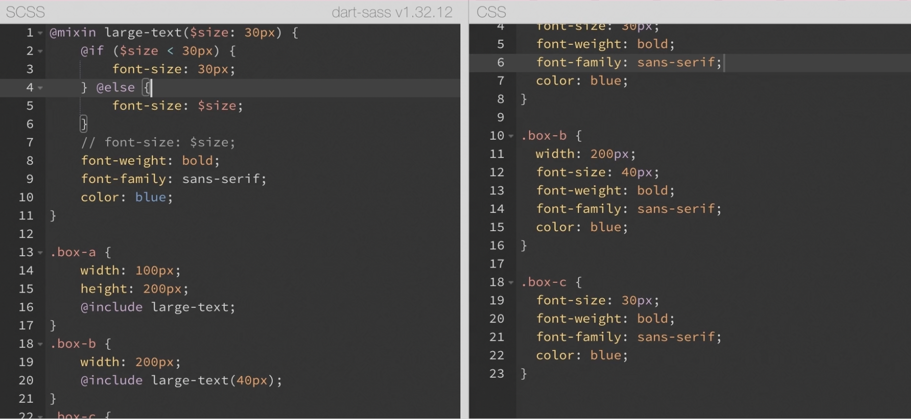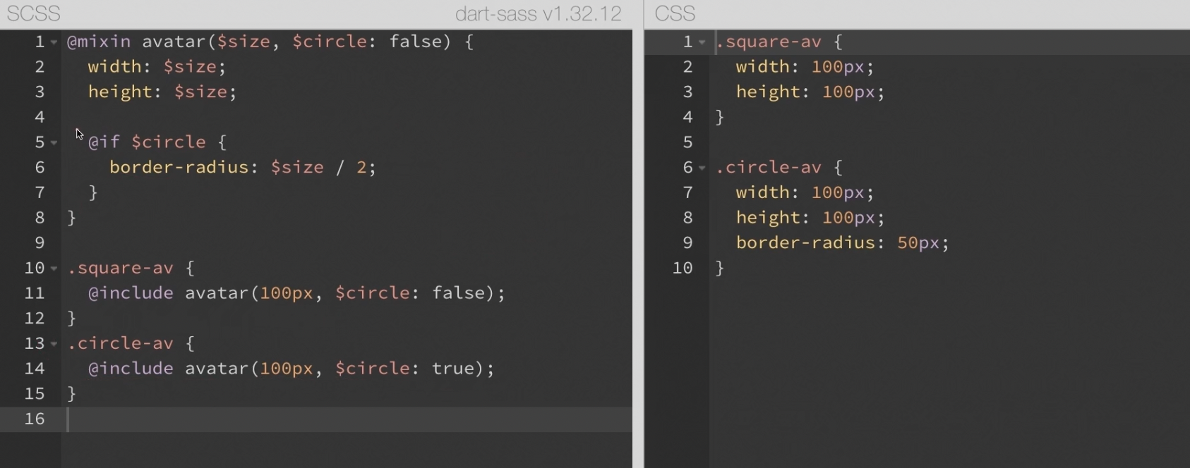 - 매개변수를 만들어 범용화해서 스타일을 재활용 / ($size: 기본값)을 지정해주어야 다른 값을 주었을 때 적용 가능