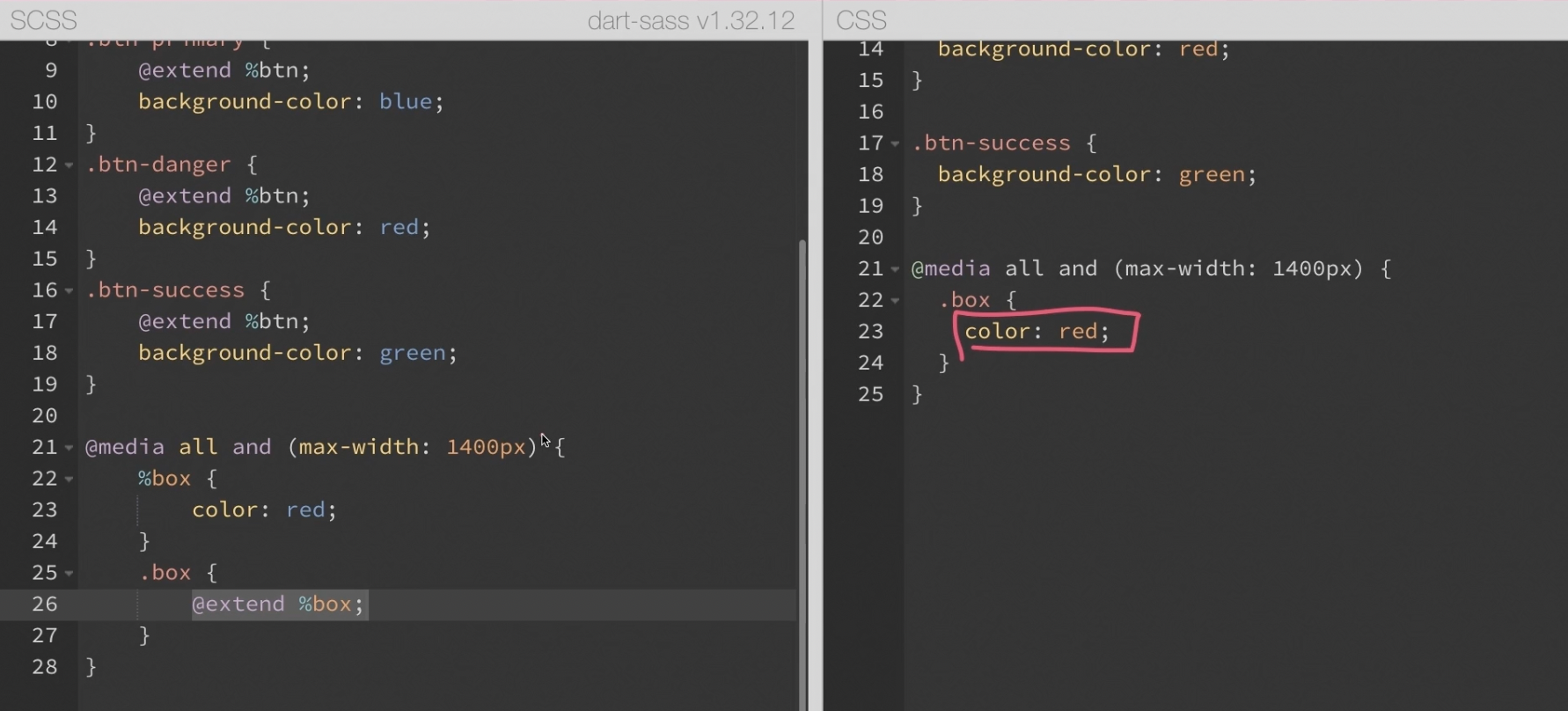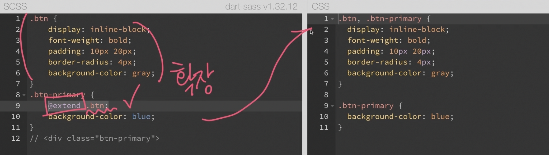 - @extend : 선택자를 불러오면 다중 선택자로 추가가 된다.