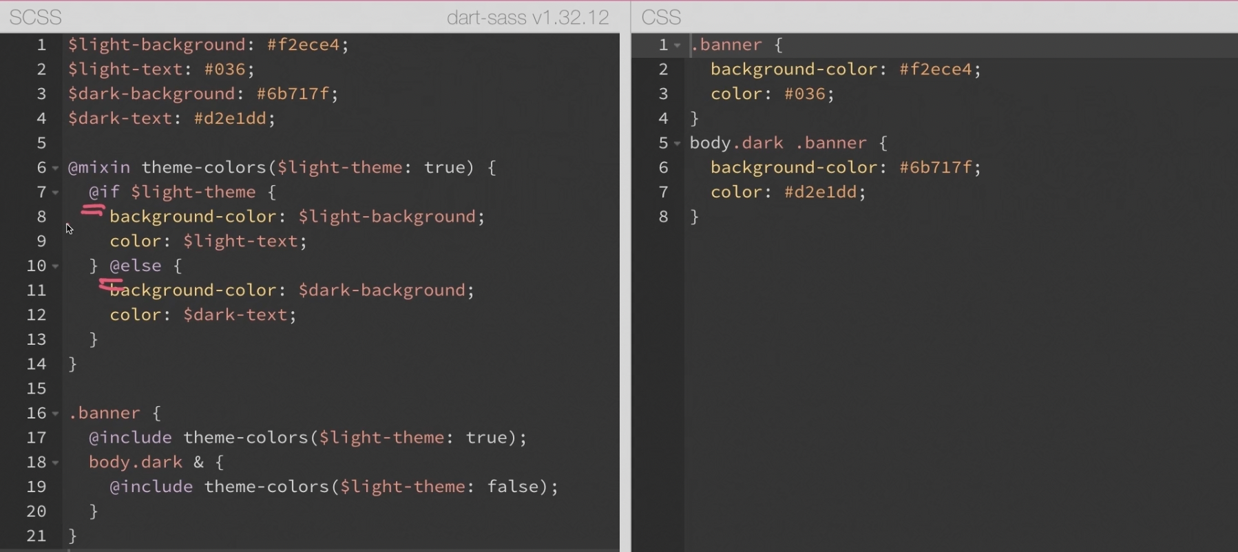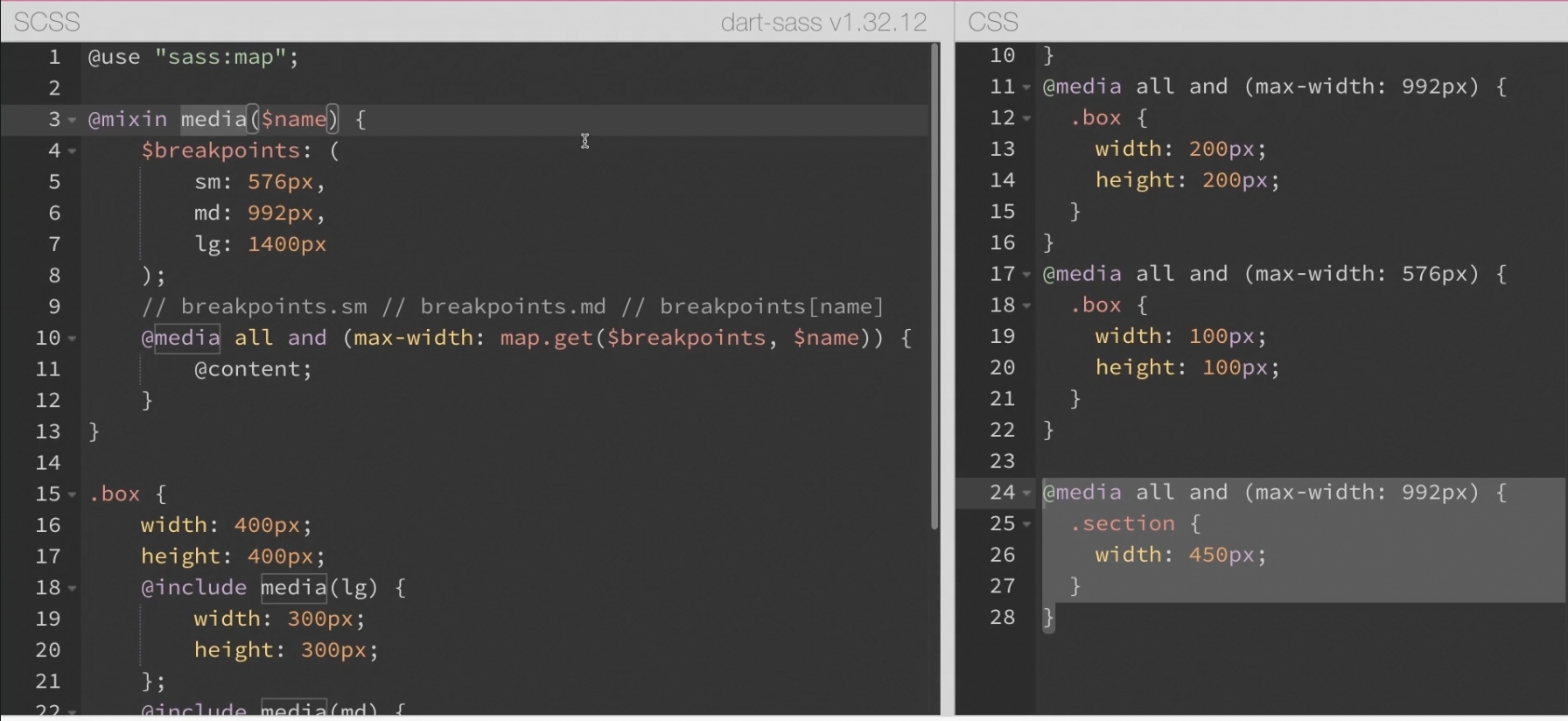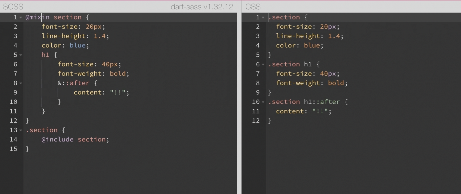 - SCSS 와 Sass의 차이점 : @mixin => = / @include => + 이처럼 표시 방법이 다르다. 나머지는 중괄호와 세미콜론의 유무