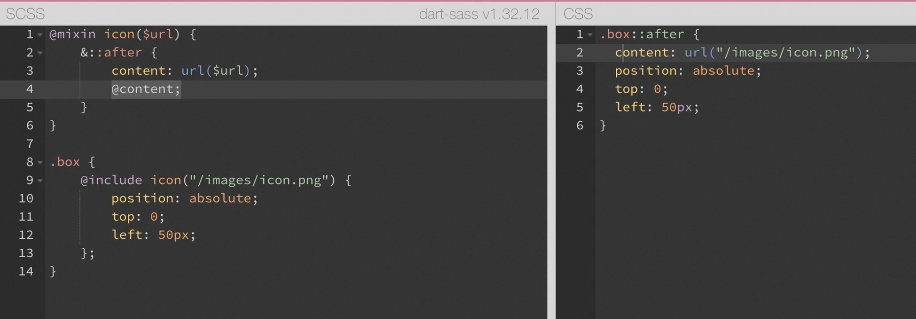 - 특정 스타일 블럭을 추가하여 @content를 통해 명시할 수 있다.