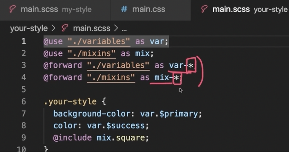 특정한 파일에서 모듈로 사용하고 있는 내용을 외부에서도 사용하려면 @forward를 써야한다.